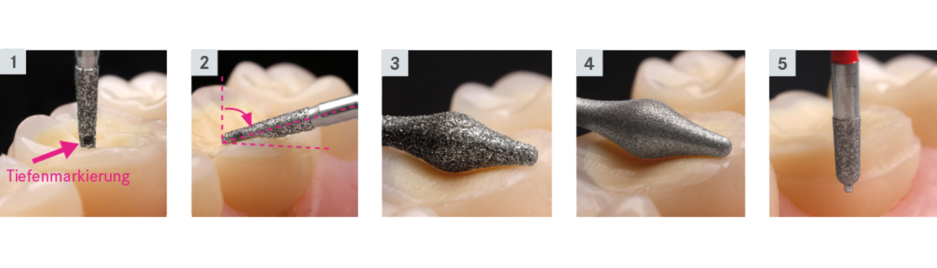 Okklusionsonlays aus Lithiumdisilikat benötigen nach derzeitigen Herstellerangaben eine Mindeststärke von 1 mm. Durch Biokorrosion geschädigte Zähne sind zudem häufig irregulär geformt. Daher bietet es sich an, die Arbeitsschritte der Tiefenmarkierung und die Vorkonturierung zu einem Prozess der Vorpräparation zu verbinden. Hierfür ist ein entsprechend geformter Diamantschleifer 1 mm* von der Instrumentenspitze mit einer schwarzen Lasermarkierung versehen. Bei entsprechender Umdrehungszahl vermittelt diese den Eindruck einer schwarzen Linie.