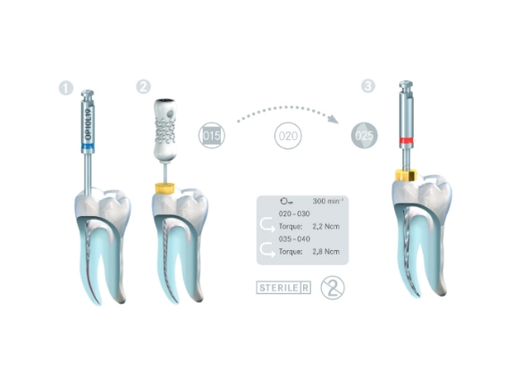 Spezialist für Endodontie, Hasselt/BelgienAblauf der rotierenden Aufbereitung im 2-Feilen-System.