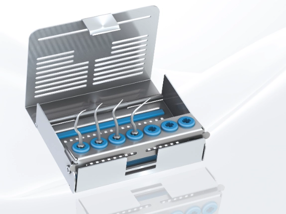 Speziell für die maschinelle Aufbereitung von Schall- und Ultraschallinstrumenten bietet Komet Ihnen hier ein besonders ausgeklügeltes System an. Nach der Behandlung können die Schall- und Ultraschallspitzen mit einem Spüladapter, der Bestandteil eines validierten Verfahrens ist, im Reinigungs- und Desinfektionsgerät aufbereitet werden. Anschließend werden die Spitzen in einer speziell konzipierten Steribox sterilisiert (je nach Risikoeinstufung verpackt oder unverpackt).