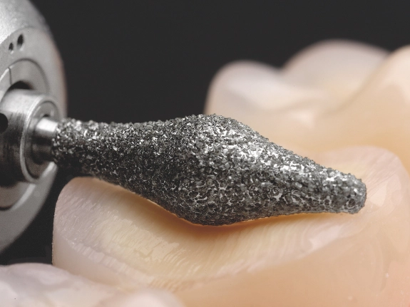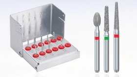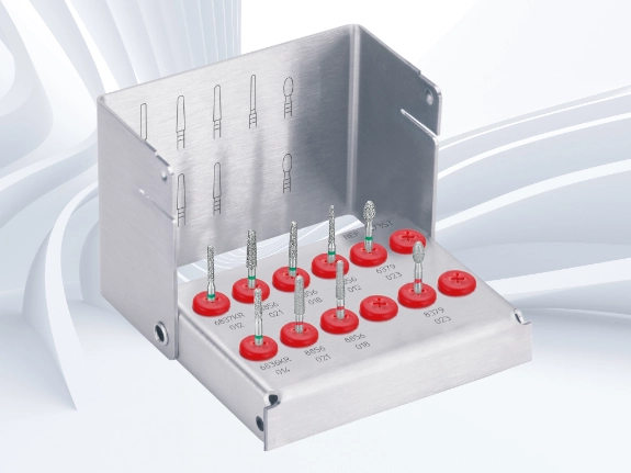 In Anlehnung an das Experten-Set 4562 für Keramik-Inlays und -Teilkronen deckt das Set 4573 die Keramik gerechte Präparation für Kronen ab. Das Hauptinstrument ist die Figur 856 (konisch rund). Das stirnseitig runde Instrument ist in verschiedenen Größen und Körnungen im Set enthalten.