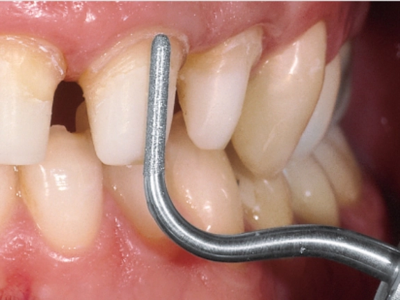 1. Interdentale Separation mit dem dünnen Instrument 6856.314.012 (konisch rund, grüner Ring).