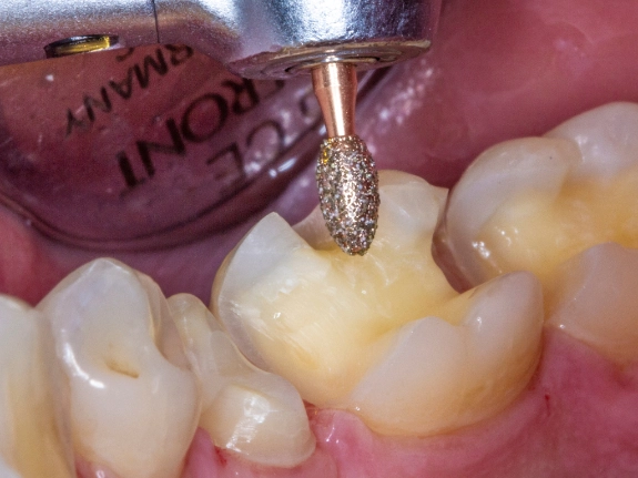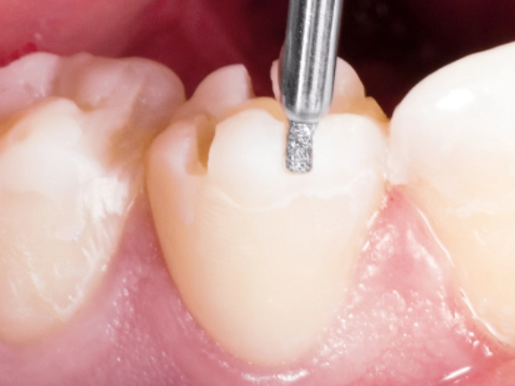 3. Nach der Separation erfolgt die stufenförmige Vorpräparation mit dem Präparationsdiamanten aus Abb. 1. Aus der parallel zur Einschubrichtung vorgenommenen Führung resultiert ein zunächst parallelwandiger Abtrag.