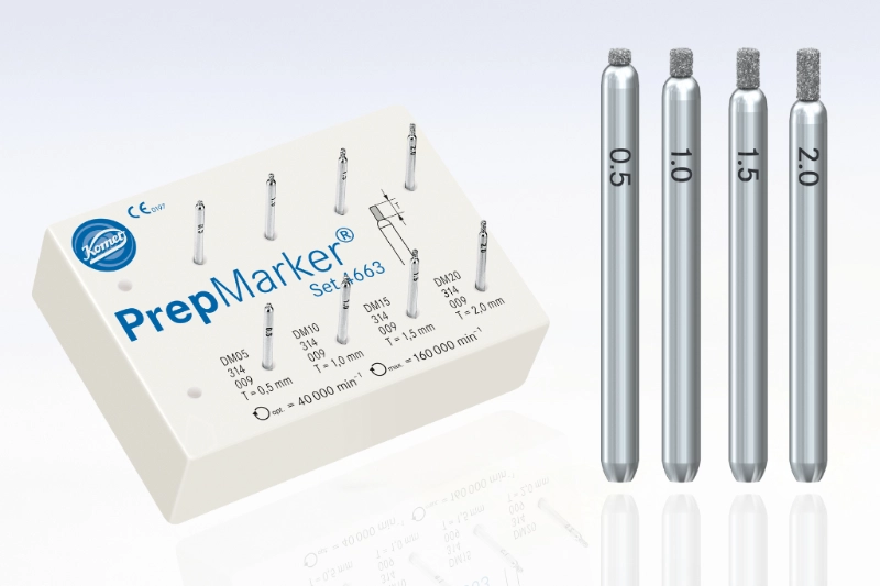 Die verschiedenen Instrumente zur Tiefenmarkierung von Komet helfen in jedem Fall dabei, diese Vorgaben exakt einzuhalten und ein sicheres Präparationsergebnis zu erreichen. Komet bietet diverse Produktvarianten zur Tiefenmarkierung: Rillenschleifer, Räder, PrepMarker und tiefenmarkierte Präparationsinstrumente.