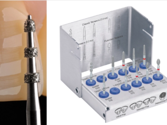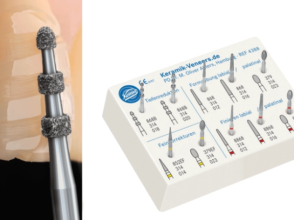 Der unbelegte Führungsstift an der Spitze verhindert ein zu steiles Eintauchen bzw. ungewolltes Eindringen bis ins Dentin. Schnitttiefen: 0,3 mm (Gr. 018) bzw. 0,4 mm (Gr. 020) Tipp: Wir empfehlen das Perfect Veneer Preparation Set 4686/ST.