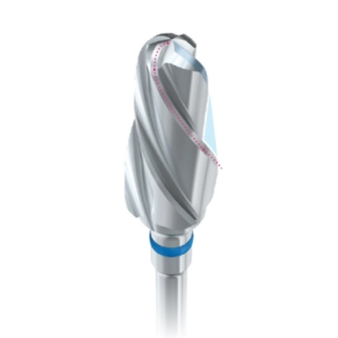 Ob grobes Ausarbeiten oder Feinschliff hängt von der spezifischen Aufgabe ab. Das Freilegen der Präparationsgrenze beispielsweise – eine wahre Meistersache – erfordert hochpräzise Arbeitsmittel. Optimal ist ein ei- bzw. birnenförmiger Hartmetallfräser, z. B. der H71EF oder der H77EF in Größe 023. Form und Verzahnung sind gut für diese Indikation geeignet. Beide Werkzeuge haben eine EF-Verzahnung. Die gute Schnittleistung sorgt für eine saubere, glatte Oberfläche und den präzisen Schliff.