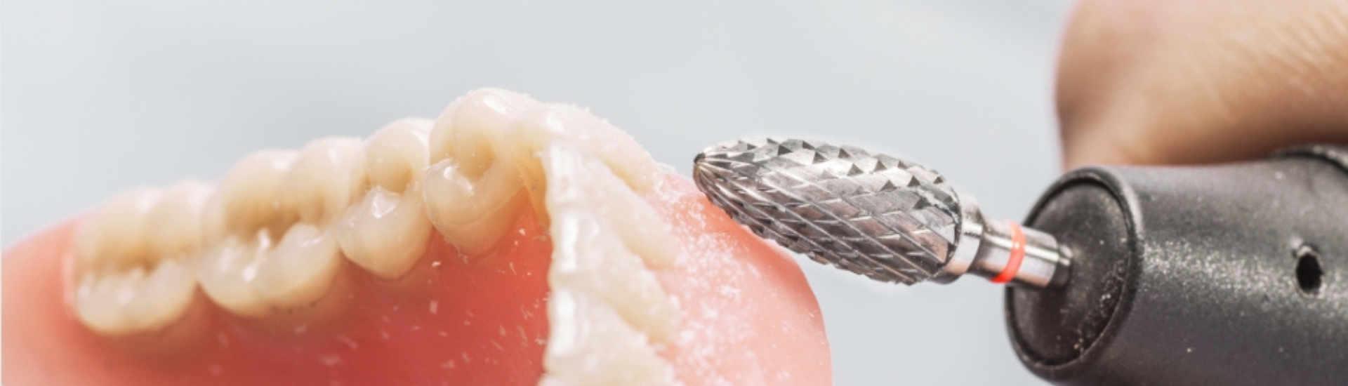 Zum Ausarbeiten von Prothesen sind kreuzverzahnte Hartmetallfräser gut geeignet. Für die grobe Formgebung nach dem Ausbetten können beispielsweise Fräser mit ACR-Verzahnung empfohlen werden. Und der EQ-Dualfräser, der eine grobe und eine feine Verzahnung aufweist, ermöglicht die effektive Bearbeitung der Prothesenränder und das Glätten der Interdentalbereiche ohne Werkzeugwechsel. Dieser Fräser kombiniert zwei Welten: Eine fein verzahnte Spitze und eine grobe Verzahnung am Arbeitsteilende. Für das Aussparen der Lippen- und Wangenbändchen sind Hartmetallfräser mit FSQ-Verzahnung (fein, schnittfreudig, Querhieb) und konischer Geometrie zielführend.