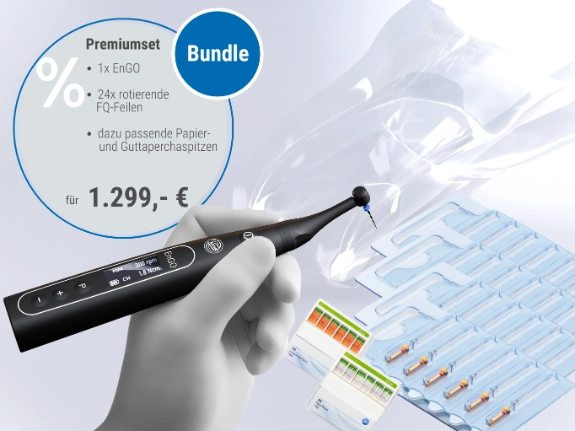 Starten Sie direkt durch: Das kabellose EnGO Handstück überzeugt mit 360°-Drehung, schlankem Kopf für beste Sicht und vorinstallierten Komet-Systemen – ob reziprokierend oder rotierend. Das Premium-Set mit Feilen für den direkten Einsatz in Ihrer Praxis jetzt zum Sonderpreis sichern! Und der Clou: Im Bundle wird EnGO mit nur 799 € ausgewiesen – damit direkt als GWG abschreibbar.
