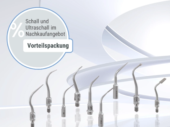 Dieses Angebot ist spitze. Wählen Sie 5 Schall- oder Ultraschallspitzen und sichern sich den Vorteilspreis. Außerdem haben Sie auch die Wahl zu 3 diamantierten Schallspitzen für unterschiedliche, innovative Behandlungsmethoden.