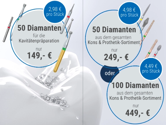 Stellen Sie sich Ihr individuelles Diamantschleifer Portfolio zusammen. Wählen Sie aus unserem rotierenden Sortiment der Kons & Prothetik und erhalten Sie 50 oder 100 Schleifer für nur 249 € bzw. 449 €. Egal ob Diamanten für die Kronenstumpfpräparation, Diamanten für die Finitur oder unsere innovative Neuheit DIAO.