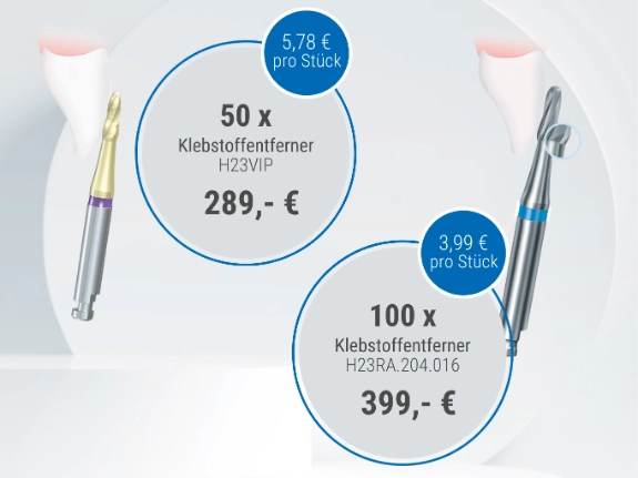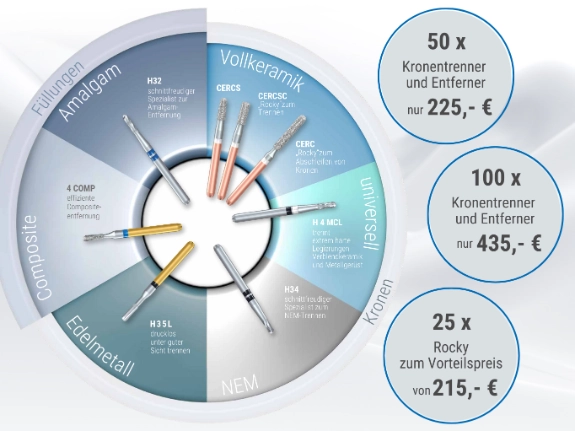 Sichern Sie sich jetzt 20 Packungen von unseren Kronentrennern und Entfernern und erhalten Sie alle Instrumente zu einem Stückpreis von nur 4,35 €. Sichern Sie sich schnell unsere Spezialisten für die Entfernung von Vollkeramik, NEM oder Edelmetallen, greifen Sie zu unseren Universaltalenten oder entfernen Sie alte Composite- oder Amalgamfüllungen mit spezialisierten Instrumenten und sparen Sie wertvolle Zeit.
