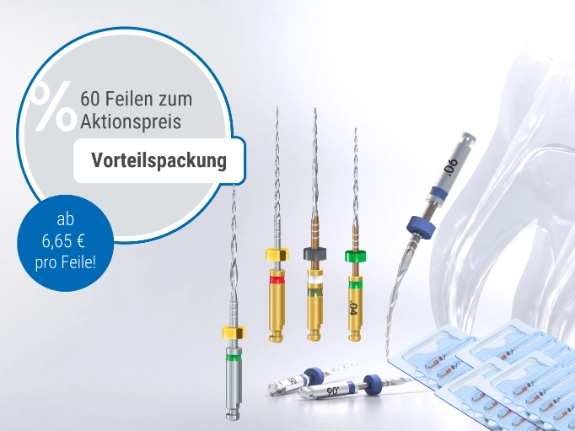 Jedes unserer maschinellen Feilensysteme gibt es auch in der günstigen Nachkaufaktion. Jetzt 60 Wurzelkanalinstrumente Ihres bevorzugten Systems kaufen und sparen.