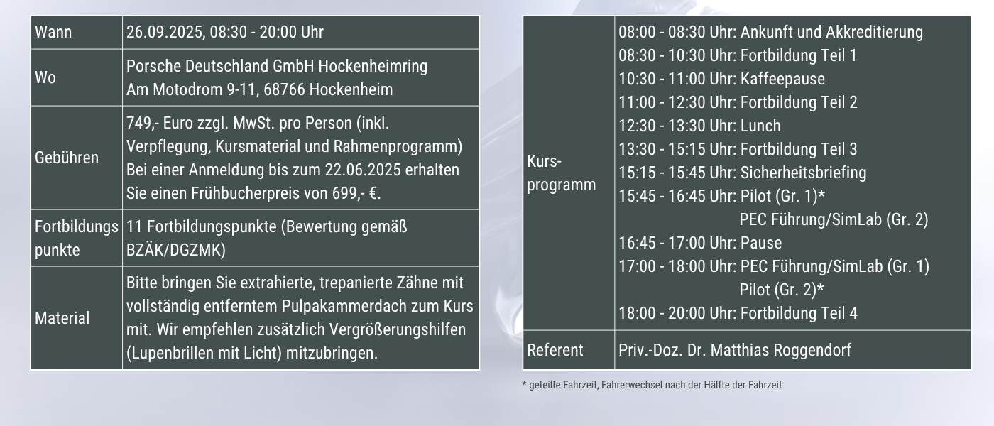 Dieser besondere EndoFIT Kurs am 26.09.2025 findet in Zusammenarbeit mit der Porsche Driving Experience statt und bietet Ihnen die Möglichkeit, Ihre Endofähigkeiten in einem exklusiven Umfeld zu verbessern. Sie haben die Gelegenheit, den gesamten endodontischen Behandlungsablauf zu erproben. Von der korrekten Präparation der Zugangskavität über die maschinelle Aufbereitung und chemische Reinigung, bis hin zur Obturation des Wurzelkanalsystems.